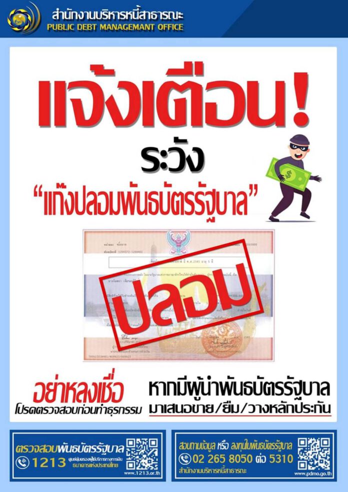 สบน.เตือนอย่าหลงเชื่อตกเป็นเหยื่อ “แก๊งปลอมพันธบัตรรัฐบาล!!”