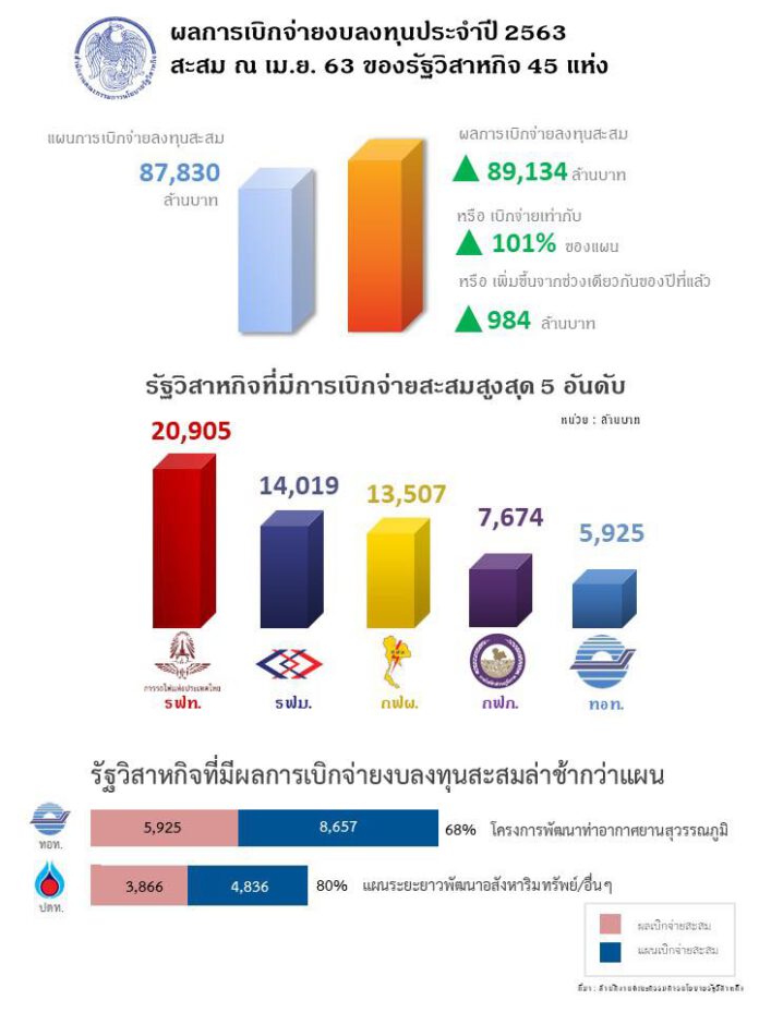 นางสาวปิยวรรณ ล่ามกิจจา รองผู้อำนวยการ สคร. รักษาการในตำแหน่งที่ปรึกษาด้านพัฒนารัฐวิสาหกิจ กล่าวเพิ่มเติมว่า ผลการเบิกจ่ายงบลงทุนสะสมของรัฐวิสาหกิจ 45 แห่ง แบ่งเป็นการเบิกจ่ายของรัฐวิสาหกิจปีงบประมาณ 34 แห่ง จำนวน 55,640 ล้านบาท หรือคิดเป็นร้อยละ 98 ของแผนการเบิกจ่ายงบลงทุนสะสม 7 เดือน (ตั้งแต่เดือนตุลาคม 2562 – เมษายน 2563) และการเบิกจ่ายของรัฐวิสาหกิจปีปฏิทิน 11 แห่ง จำนวน 33,494 ล้านบาท หรือคิดเป็นร้อยละ 108 ของแผนการเบิกจ่ายงบลงทุนสะสม 4 เดือน (ตั้งแต่เดือนมกราคม – เมษายน 2563) ทั้งนี้ มีโครงการลงทุนขนาดใหญ่ที่สามารถเบิกจ่ายได้เกินกว่าเป้าหมาย เช่น โครงการรถไฟฟ้าสายสีส้ม ช่วงศูนย์วัฒนธรรม – มีนบุรี และโครงการรถไฟฟ้าสายสีเขียว ช่วงหมอชิต – สะพานใหม่ – คูคต ของ รฟม. โครงการปรับปรุงระบบส่งไฟฟ้าภาคตะวันตกและภาคใต้เพื่อสร้างความมั่นคงของการไฟฟ้าฝ่ายผลิตแห่งประเทศไทย และแผนปรับปรุงและขยายระบบจำหน่ายพลังไฟฟ้า ฉบับที่ 12 ปี 2560 – 2564 ของการไฟฟ้านครหลวง สำหรับโครงการลงทุนขนาดใหญ่ที่เบิกจ่ายได้ต่ำกว่าเป้าหมาย เช่น โครงการพัฒนาท่าอากาศยานสุวรรณภูมิ (ปีงบประมาณ 2554 – 2560) ของบริษัท ท่าอากาศยานไทย จำกัด (มหาชน) และโครงการลงทุนโครงข่ายระบบท่อส่งก๊าซธรรมชาติ ตามแผนระบบรับส่งและโครงสร้างพื้นฐานก๊าซธรรมชาติเพื่อความมั่นคง (ระยะที่ 1 และ 2) และแผนระยะยาวพัฒนาอสังหาริมทรัพย์/อื่นๆ ของบริษัท ปตท. จำกัด (มหาชน)