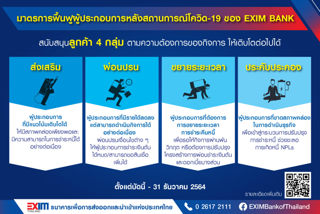 ภายใต้ “มาตรการฟื้นฟูผู้ประกอบการหลังสถานการณ์โควิด-19” ลูกค้า EXIM BANK สามารถขอขยายระยะเวลา เปลี่ยนแปลงเงื่อนไขการชำระเงินกู้ให้สอดคล้องกับธุรกิจ และขอรับวงเงินสินเชื่อเพิ่มได้ ตั้งแต่บัดนี้จนถึง 31 ธันวาคม 2564