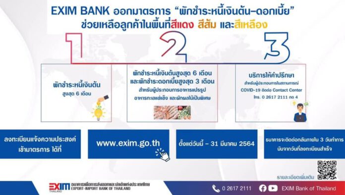 ภายใต้ “มาตรการพักชำระหนี้ในพื้นที่สีแดง สีส้ม และสีเหลือง” ลูกค้า EXIM BANK สามารถขอพักชำระหนี้เงินต้นและดอกเบี้ย โดยแจ้งความประสงค์ผ่านเว็บไซต์ของธนาคาร www.exim.go.th หรือติดต่อเจ้าหน้าที่ธนาคารที่ดูแลลูกค้า ตั้งแต่บัดนี้จนถึง 31 มีนาคม 2564 โดยธนาคารจะติดต่อกลับภายใน 3 วันทำการ