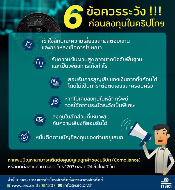 สำนักงานคณะกรรมการกำกับหลักทรัพย์และตลาดหลักทรัพย์ (ก.ล.ต.) ได้ออกคำเตือนมาว่า หากติดตามสถานการณ์ คริปโทเคอร์เรนซี จะเห็นว่า ช่วงนี้มีความผันผวนสูงมาก สำหรับคนที่สนใจลงทุน ก.ล.ต. ขอแนะนำ 6 ข้อควรระวัง ที่ต้องรู้ไว้ก่อนเริ่มลงทุน ดังนี้
