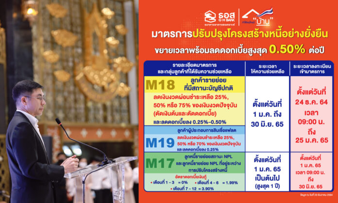 มาตรการที่ 19 [M19] : สำหรับลูกค้าผู้ประกอบการสินเชื่อแฟลต รองรับลูกค้าเดิมใน M12 เลือกแบ่งจ่ายเงินงวดผ่อนชำระ (ตัดเงินต้น ตัดดอกเบี้ย) เหลือ 25% หรือ 50% หรือ 70% ของเงินงวดผ่อนชำระปกติ และลดอัตราดอกเบี้ยเงินกู้จากผลิตภัณฑ์สินเชื่อที่ใช้อยู่ลงอีก 0.25% ต่อปี ระยะเวลาความช่วยเหลือตั้งแต่วันที่ 1 มกราคม – 30 มิถุนายน 2565 โดยสามารถลงทะเบียนแจ้งความประสงค์เข้าร่วมมาตรการได้ที่สำนักงานใหญ่และสาขาทั่วประเทศตั้งแต่วันที่ 24 ธันวาคม 2564 เวลา 9.00 น. เป็นต้นไปจนถึงวันที่ 25 มกราคม 2565