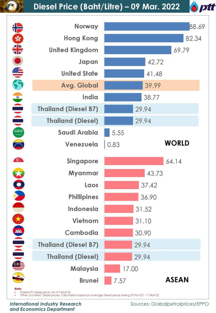 12 มีนาคม 2565 ข้อมูลจาก บริษัท ปตท. ณ วันที่ 9 มีนาคม 2565 ราคาขายปลีกน้ำมันดีเซล ณ วันที่ 9 มี.ค.65 ราคาเฉลี่ยของโลก อยู่ที่ 39.99 บาท/ลิตร ขณะที่นอร์เวย์ อยู่ที่ 88.69 บาท/ลิตร ฮ่องกง 82.34 บาท/ลิตร อังกฤษ 69.79 บาท/ลิตร ญี่ปุ่น 42.72 บาท/ลิตร สหรัฐฯ 41.48 บาท/ลิตร สำหรับประเทศในอาเซียน สิงคโปร์ 64.14 บาท/ลิตร เมียนมา 43.73 บาท/ลิตร สปป.ลาว 37.4 2 บาท/ลิตร ฟิลิปปินส์ 36.90 บาท/ลิตร อินโดนีเซีย 31.52 บาท/ลิตร เวียดนาม 31.10 บาท/ลิตร กัมพูชา 30.90 บาท/ลิตร ส่วนประเทศไทย 29.94 บาท/ลิตร