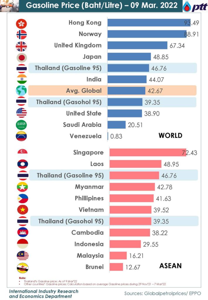 ด้านราคาขายปลีกน้ำมันเบนซิน ณ วันที่ 9 มี.ค.65 ราคาเฉลี่ยโลกอยู่ที่ 42.67 บาท/ลิตร ฮ่องกง 93.49 บาท/ลิตร นอร์เวย์ 88.91 บาท/ลิตร อังกฤษ 67.34 บาท/ลิตร ญี่ปุ่น 48.85 บาท/ลิตร สิงคโปร์ 72.43 บาท/ลิตร สปป.ลาว 48.95 บาท/ลิตร เมียนมา 42.78 บาท/ลิตร ฟิลิปปินส์ 41.63 บาท/ลิตร เวียดนาม 39.52 บาท/ลิตร ส่วนประเทศไทย เบนซิน 95 ราคาอยู่ที่ 46.76 บาท/ลิตร และแก๊สโซฮอล์ 95 ราคาอยู่ที่ 39.35 บาท/ลิตร