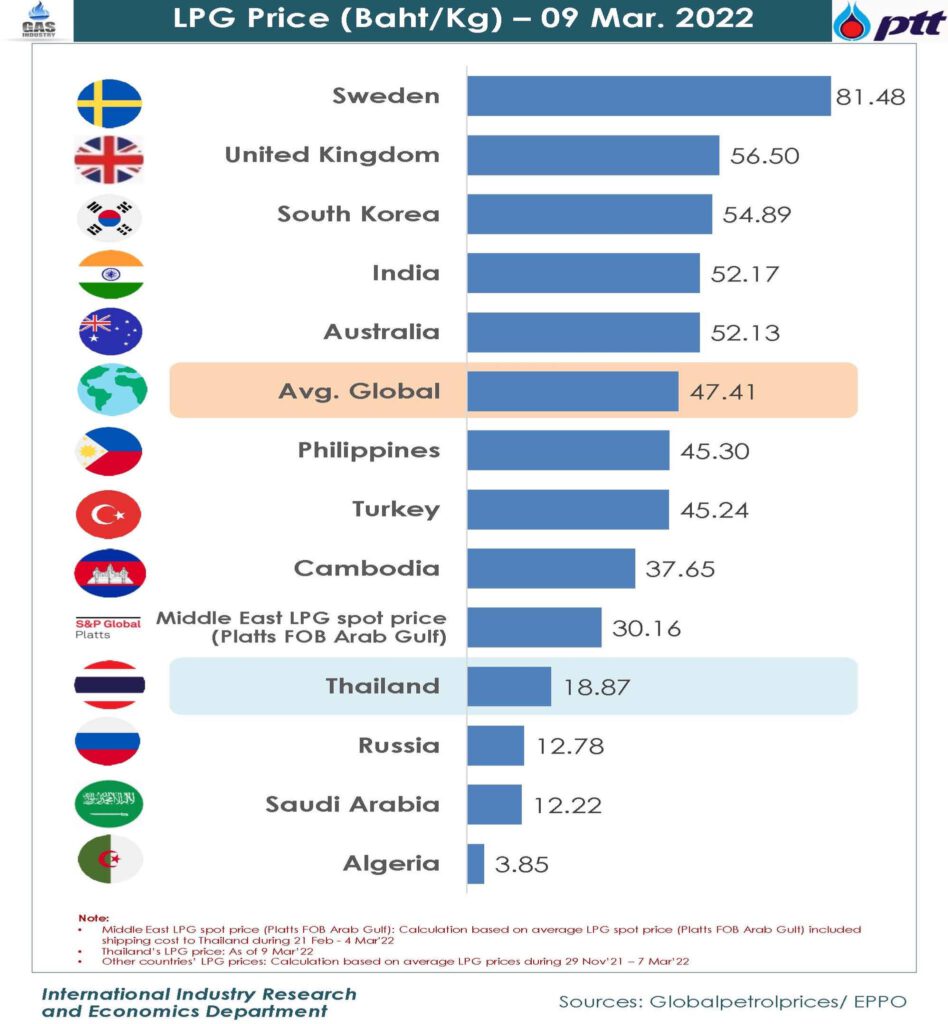 สำหรับราคาก๊าซ LPG ภาคครัวเรือน ณ วันที่ 9 มี.ค.65 ราคาเฉลี่ยโลกอยู่ที่ 47.41 บาท/กก. สวีเดน 81.48 บาท/กก. อังกฤษ 56.50 บาท/กก. เกาหลีใต้ 54.89 บาท/กก. อินเดีย 52.17 บาท/กก. ออสเตรเลีย 52.13 บาท/กก. ฟิลิปปินส์ 45.30 บาท/กก. กัมพูชา 37.65 บาท/กก. ไทย 18.87 บาท/กก. รัสเซีย 12.7 8 บาท/กก.