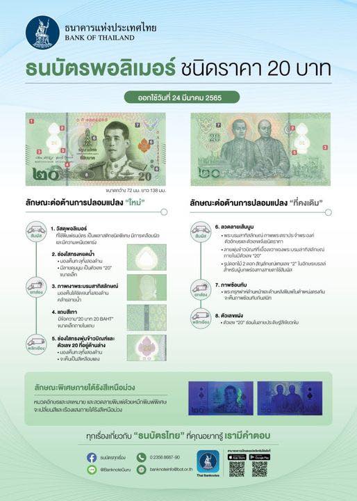 26 มีนาคม 65 ธนาคารแห่งประเทศไทยเผย ธนบัตรพอลิเมอร์ 20 บาท แบบใช้จ่ายหมุนเวียน เริ่มใช้ในระบบแล้วตั้งแต่บัดนี้เป็นต้นไป สามารถแลกได้ที่ธนาคารทั่วประเทศและสถาบันการเงินเฉพาะกิจทุกแห่ง ส่วนธนบัตรแบบกระดาษยังใช้ได้ตามปกติ
