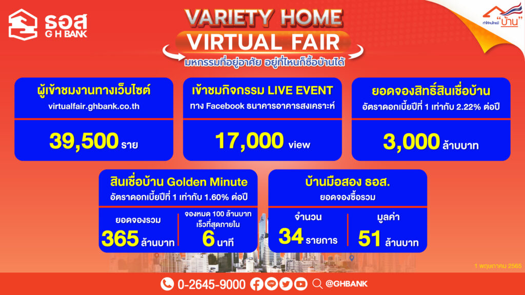 business highlight online : 1 พฤษภาคม 65 ธนาคารอาคารสงเคราะห์ (ธอส.) เผยความสำเร็จของการจัดงาน “GHB VARIETY HOME VIRTUAL FAIR : มหกรรมที่อยู่อาศัยออนไลน์จาก ธอส.” ซึ่งจัดขึ้นเป็นครั้งแรก โดยตลอดทั้ง 7 วัน มีลูกค้าประชาชนเข้าร่วมงานทางเว็บไซต์ virtualfair.ghbank.co.th ถึง 39,500 ราย และมีผู้เข้าชมกิจกรรม LIVE EVENT ใน Facebook ธนาคารอาคารสงเคราะห์ รวมกว่า 17,000 View ขณะที่สินเชื่อบ้านอัตราดอกเบี้ยพิเศษมียอดจองสิทธิ์สินเชื่อรวมมากกว่า 3,365 ล้านบาท สะท้อนความพร้อมการก้าวสู่การเป็น Digital Bank