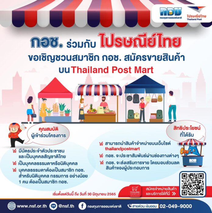 นางสาวจารุลักษณ์ เรืองสุวรรณ เลขาธิการคณะกรรมการกองทุนการออมแห่งชาติ (กอช.) เปิดเผยว่า กองทุนการออมแห่งชาติ (กอช.) ร่วมกับ บริษัท ไปรษณีย์ไทย จำกัด ขอเชิญชวนสมาชิก กอช. เข้าร่วมกิจกรรมจำหน่ายสินค้าบนเว็บไซต์ Thailand post mart เป็นอีกหนึ่งช่องทางในการส่งเสริมการขายให้สมาชิก กอช. นอกจากจะมีรายได้เพิ่มขึ้นแล้ว ยังมีเงินออมกับ กอช. ไว้ใช้ยามเกษียณหลังอายุ 60 ปี  เป็นรายเดือน พร้อมรับเงินสมทบเพิ่มจากรัฐตามช่วงอายุ สูงสุด 100% หรือไม่เกิน 1,200 บาทต่อปี ในเดือนถัดไป โดยผู้สนใจเข้าร่วมโครงการจะต้องเป็นสมาชิก กอช. ที่มีอายุระหว่าง 15 – 60 ปี เป็นผู้ประกอบการบุคคลธรรมดาหรือนิติบุคคล หรือมีคุณสมบัติตรงตามเงื่อนไข จะได้รับสิทธิประโยชน์ตามโครงการ สำหรับผู้ที่สนใจสามารถสมัครลงทะเบียนเข้าร่วมได้ตั้งแต่วันนี้ – วันที่ 30 มิถุนายน 2565 สอบถามรายละเอียดเพิ่มเติมได้ที่ กองทุนการออมแห่งชาติ สายด่วนเงินออม โทร. 02-049-9000