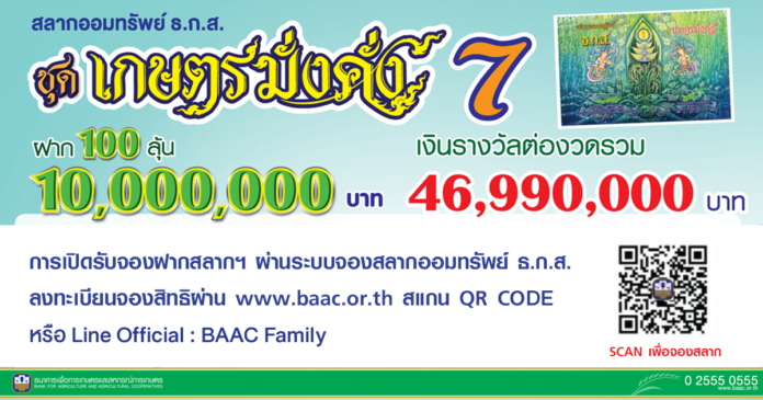 business highlight online : 1 มิถุนายน 2565 ธ.ก.ส. เปิดรับฝาก “สลากออมทรัพย์ ธ.ก.ส. ชุดเกษตรมั่งคั่ง 7” หน่วยละ 100 บาท จำนวน 1,000 ล้านหน่วย วงเงิน 100,000 ล้านบาท ฝากครบ 3 ปี ได้รับดอกเบี้ยหน่วยละ 0.18 บาท พร้อมลุ้นรางวัลที่ 1 สูงสุด 10 ล้านบาท และรางวัลอื่นๆ รวมมูลค่ากว่า 46 ล้านบาทต่อเดือน พิเศษ ! สำหรับลูกค้าเกษตรกรบุคคล สามารถใช้สิทธิ์ผ่านระบบจองสลากได้ สูงสุดไม่เกิน 1 แสนบาทและลูกค้าผู้ฝากสลากออมทรัพย์ ธ.ก.ส. ชุดเกษตรมั่งคั่ง 4 ที่ครบกำหนด ไม่เกิน 5 ล้านบาท โดยช่วงที่ 1 เปิดจองวันที่ 6 – 10 มิถุนายน 2565 และเปิดรับฝาก ตั้งแต่ 17 มิถุนายน – 15 ตุลาคม 2565 และช่วงที่ 2 เปิดจองวันที่ 5 – 9 กันยายน 2565 และเปิดรับฝาก ตั้งแต่ 19 กันยายน 2565 เป็นต้นไป ผ่านแอปพลิเคชัน ธ.ก.ส. A-Mobile หรือ ธ.ก.ส. ทุกสาขาทั่วประเทศ