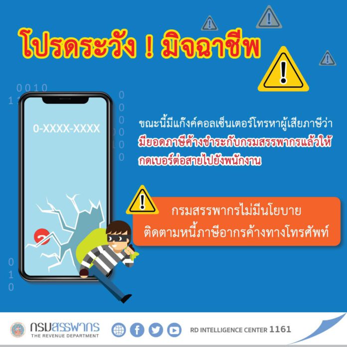 กรมสรรพากรเตือนอย่าหลงเชื่อมิจฉาชีพแอบอ้างติดตามให้ชำระหนี้ภาษีค้างทางโทรศัพท์