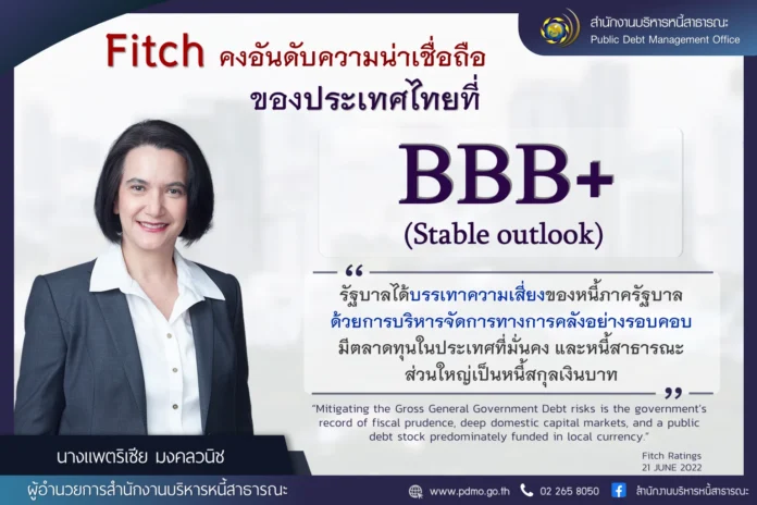 พลเอก ประยุทธ์ จันทร์โอชา นายกรัฐมนตรี และ รมว.กลาโหม รับทราบผลและรู้สึกยินดีที่บริษัท Fitch Ratings (Fitch) ได้เปิดเผยรายงาน (21 มิ.ย. 65) คงอันดับความน่าเชื่อถือของประเทศไทย (Sovereign Credit Rating) ที่ BBB+ และมุมมองความน่าเชื่อถืออยู่ในระดับมีเสถียรภาพ (Stable Outlook)