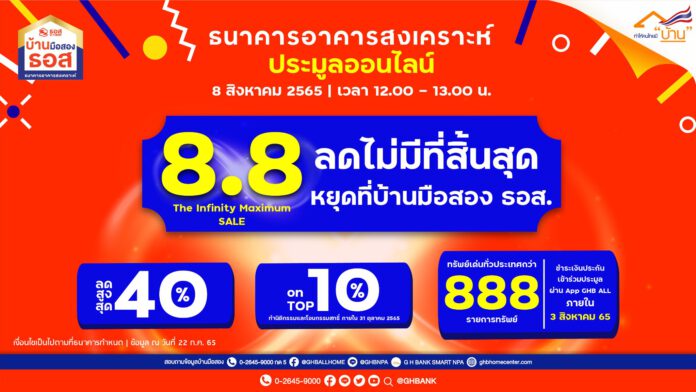 business highlight online : 1 สิงหาคม 2565 ธนาคารอาคารสงเคราะห์ (ธอส.) จัดงาน “ประมูลออนไลน์บ้านมือสอง ธอส. 8.8 : The Infinity Maximum Sale” ในวันจันทร์ที่ 8 สิงหาคม 2565 เวลา 12.00-13.00 น. โดยนำบ้านมือสองคุณภาพดี ทำเลเด่น และราคาคุ้มค่ารวม 888 รายการ แบ่งเป็นทรัพย์ในพื้นที่กรุงเทพฯ และปริมณฑล จำนวน 238 รายการ และทรัพย์ในภูมิภาค 650 รายการ ทั้งประเภทบ้านเดี่ยว บ้านแฝด ทาวน์เฮ้าส์ ห้องชุด(คอนโดมิเนียม) และที่ดินเปล่า พร้อมส่วนลด สูงสุด 40% จากราคาปกติ โดยทรัพย์ที่มีราคาเริ่มต้นประมูลต่ำสุดเพียง 130,000 บาท ได้แก่ ทรัพย์ประเภทที่ดินเปล่า ขนาดเนื้อที่ 43.50 ตารางวา ในโครงการหมู่บ้านเครือวัลย์ อ.เมืองอุบลราชธานี จ.อุบลราชธานี ขณะที่ทรัพย์เด่นทำเลดีที่น่าสนใจ ได้แก่ ทรัพย์ประเภททาวน์เฮ้าส์ ขนาดเนื้อที่ 46 ตารางวา ในโครงการหมู่บ้านพฤกษาวิลล์ 62/2 เขตคลองสามวา กรุงเทพฯ ราคาเริ่มต้นประมูลที่ 2,700,000 บาท ซึ่งเป็นทรัพย์ที่เดินทางได้หลายเส้นทาง และใกล้สิ่งอำนวยความสะดวกมากมาย อาทิ โรงเรียน โรงพยาบาล และห้างสรรพสินค้า และทรัพย์ประเภทบ้านเดี่ยว 1 ชั้น ขนาดเนื้อที่ 51 ตาราวา ในโครงการหมู่บ้านลักษิกา (โคราชวิลเลจ 5) อ.เมืองนครราชสีมา จ.นครราชสีมา ราคาเริ่มต้นประมูลที่ 1,700,000 บาท ซึ่งเป็นทรัพย์ที่อยู่ในตัวเมือง เดินทางสะดวก เหมาะสำหรับการอยู่อาศัยเป็นอย่างมาก พิเศษ!! ผู้ชนะการประมูลจะได้รับส่วนลดเพิ่มอีก 10 % จากราคาที่ปิดประมูลเพียงทำสัญญาและทำนิติกรรมให้แล้วเสร็จภายในวันที่ 31 ตุลาคม 2565 และฟรีค่าประเมินราคาทรัพย์สิน เพื่อช่วยลดค่าใช้จ่ายสำหรับผู้ที่ต้องการมีที่อยู่อาศัยเป็นของตนเองด้วย