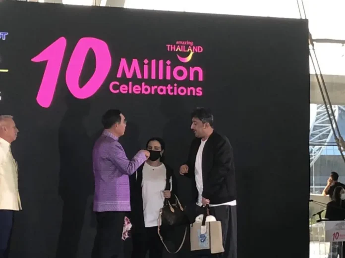 พลเอกประยุทธ์  จันทร์โอชา นายกรัฐมนตรี เป็นประธานในพิธีต้อนรับนักท่องเที่ยวผู้ที่โชคดีที่สุด (The Luckiest Tourist ) ในกิจกรรม “Amazing Thailand 10 Million Celebrations” ฉลองต้อนรับนักท่องเที่ยวต่างชาติครบ 10 ล้านคน ตามเป้าหมายสูงสุดปี 2565 ที่การท่องเที่ยวแห่งประเทศไทย (ททท.) ตั้งไว้ ประกาศความสำเร็จแบรนด์ Amazing Thailand เพื่อตอกย้ำความเชื่อมั่นประเทศไทยเป็นจุดหมายปลายทางยอดนิยมในใจนักท่องเที่ยว เตรียมเดินหน้าดันยอดนักท่องเที่ยวต่างชาติสู่ 20 ล้านคนในปี 2566 ซึ่งการท่องเที่ยวแห่งประเทศไทย กระทรวงการท่องเที่ยวและกีฬา จัดกิจกรรมในโอกาสที่นักท่องเที่ยวต่างชาติเดินทางเข้าประเทศไทยในปี 2565 ครบ 10 ล้านคน เพื่อเฉลิมฉลองและต้อนรับนักท่องเที่ยวที่เดินทางเข้ามายังประเทศไทย ทั้งทางบกและทางอากาศทั่วประเทศ ได้แก่ ท่าอากาศยานสุวรรณภูมิ ท่าอากาศยานดอนเมือง ท่าอากาศยานนานาชาติอู่ตะเภา ระยอง-พัทยา ท่าอากาศยานเชียงใหม่ ท่าอากาศยานภูเก็ต ท่าอากาศยานนานาชาติกระบี่ และสนามบินสมุย ด่านพรมแดนหนองคาย และด่านพรมแดนสะเดา