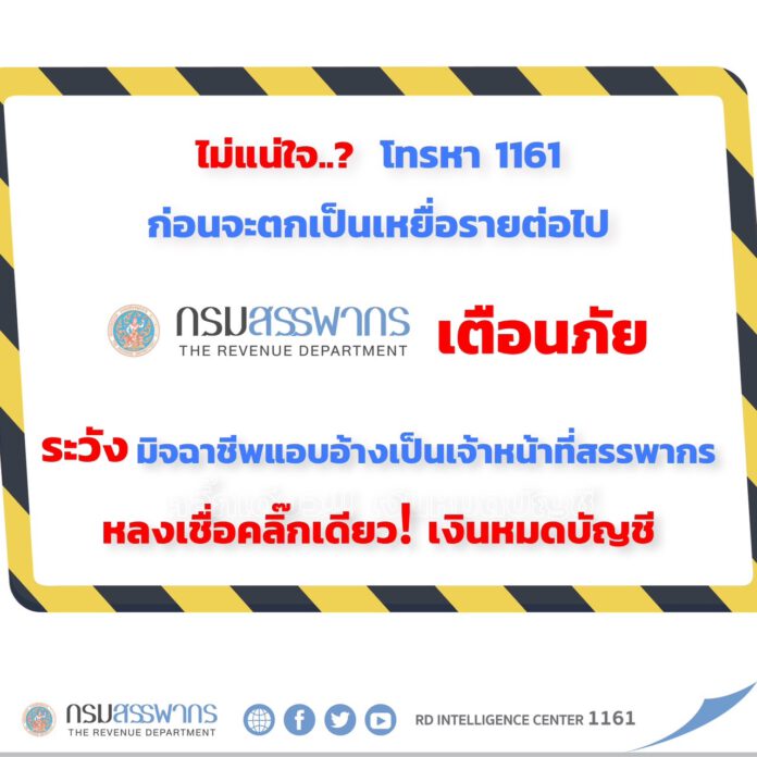 กรมสรรพากร จึงขอแนะนำให้พี่น้องประชาชนที่ได้รับการติดต่อจากผู้ที่แอบอ้างว่าเป็นเจ้าหน้าที่สรรพากร แจ้งให้ดำเนินการในเรื่องใดก็ตาม ขอให้โทรมาสอบถามข้อเท็จจริงเกี่ยวกับเรื่องดังกล่าวที่ศูนย์สารนิเทศสรรพากร โทร. 1161 เพื่อป้องกันการตกเป็นเหยื่อของมิจฉาชีพ ที่แอบอ้างเป็นเจ้าหน้าที่สรรพากร อย่างไรก็ตามในช่วงเวลาการยื่นแบบแสดงรายการภาษีเงินได้บุคคลธรรมดา มีผู้ขอรับบริการเป็นจำนวนมาก ประชาชนสามารถสอบถามไปยังช่องทางอื่นๆ อาทิ สำนักงานสรรพากรพื้นที่ หรือ สำนักงานสรรพากรพื้นที่สาขา ใกล้บ้านท่านทุกแห่งทั่วประเทศ