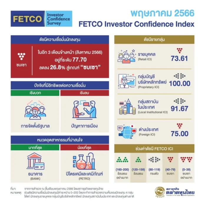 นายกอบศักดิ์ ภูตระกูล ประธานกรรมการสภาธุรกิจตลาดทุนไทย (FETCO) เปิดเผยดัชนีความเชื่อมั่นนักลงทุน (FETCO Investor Confidence Index : ICI) เดือน พ.ค.2566 (สำรวจระหว่างวันที่ 22—31 พ.ค. 2566) พบว่าในอีก 3 เดือนข้างหน้า ICI อยู่ที่ระดับ 77.70 ปรับลดลง 26.8% จากเดือนก่อนหน้ามาอยู่ในเกณฑ์ “ซบเซา” เป็นครั้งแรกในรอบ 8 เดือน โดยนักลงทุนมองว่าการจัดตั้งรัฐบาลหลังการเลือกตั้งจะเป็นปัจจัยหนุนความเชื่อมั่นมากที่สุด รองลงมาคือการฟื้นตัวของภาคท่องเที่ยว และการฟื้นตัวของเศรษฐกิจในประเทศ สำหรับปัจจัยที่ฉุดความเชื่อมั่นนักลงทุนมากที่สุด ได้แก่ ปัญหาการเมืองหลังการเลือกตั้ง รองลงมาคือการถดถอยของเศรษฐกิจในประเทศ และการเก็บภาษีตลาดทุน