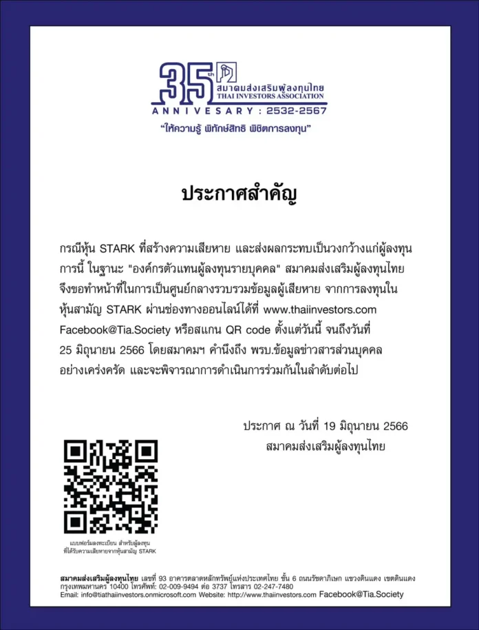 business highlight online : 21 มิถุนายน 2566 ราคาหุ้น STARK เหลือ 1 สตางค์ระหว่างซื้อขาย วอนผู้เสียหายร่วมฟ้องหมู่ ร่วมกับสมาคมส่งเสริมผู้ลงทุนไทย ลงทะเบียน 19-25 มิ.ย.