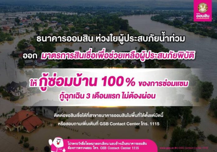 ทั้งนี้ ลูกค้าหรือผู้ประสบภัย สามารถติดต่อขอสินเชื่อได้ที่สาขาธนาคารออมสินในพื้นที่ได้ตั้งแต่บัดนี้หรือสอบถามเพิ่มเติมที่ GSB Contact Center โทร. 1115