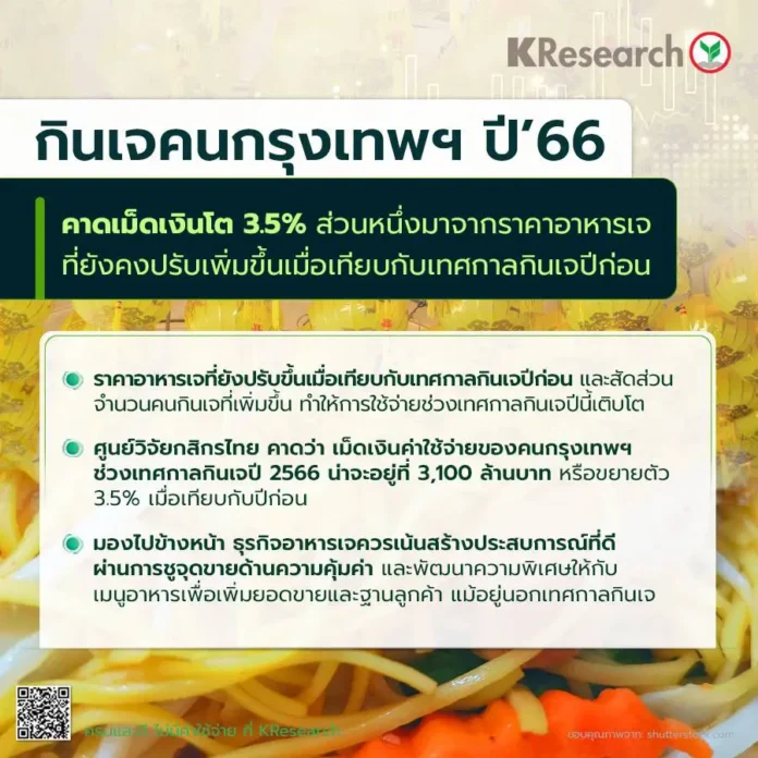 business highlight online : 11 ตุลาคม 2566 ศูนย์วิจัยกสิกรไทยคาด คน กทม.กินเจเงินสะพัด 3.1 พันล้านบาทโต 3.5% ตามราคาอาหาร-น้ำมันแพง 2.5% ส่วนปริมาณการบริโภคเติบโตราว 1.0% เมื่อเทียบกับปีก่อน