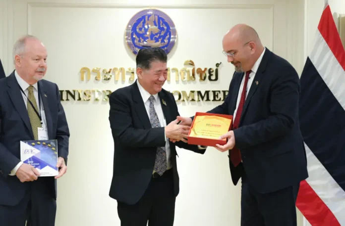 นอกจากนี้ ยังได้ให้ข้อมูลเกี่ยวกับแผนในการเร่งจัดทำความตกลงการค้าเสรี หรือ FTA กับ สหภาพยุโรป หรืออียู ที่มีเป้าหมายสรุปการเจรจาให้ได้ภายในปี 2568 เพื่อเพิ่มศักยภาพการค้าการลงทุนระหว่าง ไทยและอียูอย่างมีนัยสำคัญ รวมถึงแผนที่จะทบทวนและปรับปรุงแก้ไขกฎหมาย เพื่อสร้างระบบนิเวศน์ที่เอื้อต่อการประกอบธุรกิจการลงทุน และรองรับการเปลี่ยนแปลงของสถานการณ์โลก และเห็นว่าในการปฏิบัติตามกฎระเบียบการค้าใหม่ ๆ ทุกประเทศและทุกฝ่ายควรดำเนินการร่วมกันอย่างฉันท์มิตร คำนึงถึงข้อเท็จจริง และระดับความแตกต่าง มีความยืดหยุ่นในการปฏิบัติตาม และระยะเวลาการปรับตัวของแต่ละประเทศ ทั้งนี้ ตนให้ความสำคัญกับการส่งเสริมความร่วมมืออย่างใกล้ชิดระหว่างภาครัฐ-เอกชน รวมถึงเอกชน-เอกชนในส่วนผู้แทนภาคธุรกิจของฝั่งยุโรปได้แสดงความยินดีที่ FTA ไทย–อียู กลับมาเจรจาอีกครั้ง โดยพร้อมสนับสนุนและผลักดันให้ได้ข้อสรุปโดยเร็ว เพื่อต่อยอดโอกาสทางธุรกิจและอำนวยความสะดวกทางการค้าให้ภาคเอกชนและยังได้หยิบยกประเด็นการค้าอื่น ๆ เช่น ทรัพย์สินทางปัญญา การควบคุมราคาสินค้า พ.ร.บ. การประกอบธุรกิจของคนต่างด้าว ขึ้นหารือกับกระทรวงพาณิชย์ โดยได้รับทราบนโยบายและข้อมูลที่ชัดเจน เพื่อประโยชน์ในการดำเนินธุรกิจและวางแผนการค้าการลงทุนต่อไป