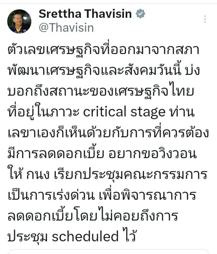 นายเศรษฐา ทวีสิน นายกรัฐมนตรี โพสต์ข้อความผ่าน X (ทวิตเตอร์) เมื่อคืนวันที่ 19 ก.พ. เรียกร้องคณะกรรมการนโยบายการเงิน (กนง.) เรียกประชุมเป็นการเร่งด่วน เพื่อพิจารณาการลดดอกเบี้ย โดยไม่ต้องคอยถึงการประชุมตามกำหนด หลังจากตัวเลขเศรษฐกิจที่ออกมาจากการรายงานของสภาพัฒนาการเศรษฐกิจและสังคมแห่งชาติ (สศช.) หรือ สภาพัฒน์ บ่งบอกถึงสถานะของเศรษฐกิจไทยที่อยู่ในภาวะ Critical stage ซึ่งเลขาธิการสภาพัฒน์เอง ก็เห็นด้วยกับการที่ควรต้องปรับลดดอกเบี้ย
