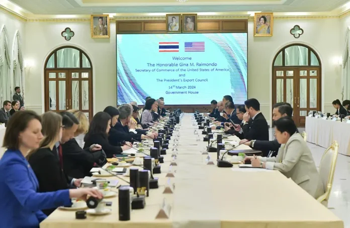 วันนี้ (14 มีนาคม 2567) เวลา 16.30 น. ณ ตึกภักดีบดินทร์ ทำเนียบรัฐบาล นายเศรษฐา ทวีสิน นายกรัฐมนตรีและรัฐมนตรีว่าการกระทรวงการคลัง หารือร่วมกับ นางจีนา เอ็ม. เรมอนโด (The Honorable Gina M. Raimondo) รัฐมนตรีว่าการกระทรวงพาณิชย์สหรัฐอเมริกา พร้อมด้วยนาย Mark Ein ประธานสภาผู้ส่งออกแห่งประธานาธิบดีสหรัฐอเมริกา (The President’s Export Council: PEC) และคณะ รวม 10 ราย ซึ่งมาจากภาคเอกชนและองค์กรชั้นนำของสหรัฐฯ แลกเปลี่ยนข้อคิดเห็นและส่งเสริมโอกาสขยายการค้าและการลงทุนระหว่างกัน โดยภายหลังเสร็จสิ้น นายชัย วัชรงค์ โฆษกประจำสำนักนายกรัฐมนตรี เปิดเผยสาระสำคัญของการหารือ ดังนี้