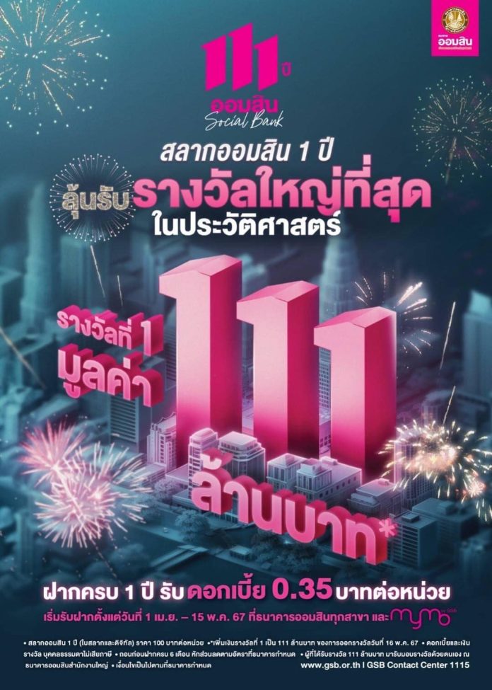 Business Highlight Online : 27 มีนาคม 2567 ออมสิน จัดเต็มแจกรางวัลที่ 1 สลากออมสิน 111 ล้านบาท ฉลองครบรอบ 111 ปี เปิดรับฝาก 1 เม.ย. – 15 พ.ค. 67 จับรางวัลผู้โชคดี 16 พ.ค. 67 พร้อมโปรโมชันเฉลิมฉลองอีกมากมาย