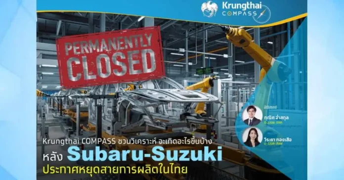 ในเบื้องต้น Krungthai COMPASS คาดว่าเหตุการณ์นี้จะทำให้ปริมาณการผลิตรถยนต์ไทยปรับลดลงราว 6,500 คัน ในปี 2568 จากคาดการณ์เดิม 1,800,000 คัน เหลือ 1,793,500 คัน อย่างไรก็ดี อาจเป็นสัญญาณเตือนแรกว่า อุตสาหกรรมยานยนต์ไทยกำลังเผชิญกับความท้าทายครั้งใหญ่ และต้องจับตาต่อไปว่าจะมีค่ายรถยนต์รายอื่น ๆ ต้องหยุดสายการผลิตซ้ำรอยกับ Subaru และ Suzuki อีกหรือไม่
