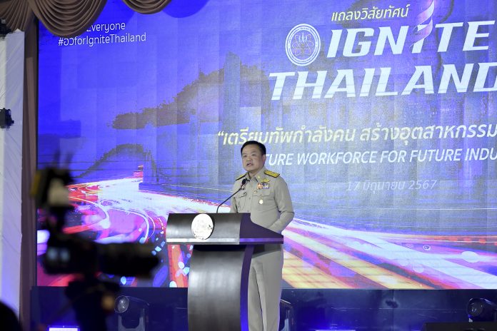 วันนี้ (17 มิ.ย.67) เวลา 13.30 น. ณ ตึกสันติไมตรี (หลังนอก) ทำเนียบรัฐบาล นายเศรษฐา ทวีสิน นายกรัฐมนตรี มอบหมาย นายอนุทิน ชาญวีรกูล รองนายกรัฐมนตรีและรัฐมนตรีว่าการกระทรวงมหาดไทย เป็นประธานในพิธีเปิดงานแถลงวิสัยทัศน์ “เตรียมทัพกำลังคน สร้างอุตสาหกรรมอนาคต” IGNITE THAILAND : Future Workforce for Future Industry โดย น.ส.ศุภมาส อิศรภักดี รัฐมนตรีว่าการกระทรวงการอุดมศึกษา วิทยาศาสตร์ วิจัยและนวัตกรรม (อว.) แถลงแนวทาง “การสร้างกำลังคนรองรับกลุ่มอุตสาหกรรมแห่งอนาคต” เพื่อนำเสนอแผนผลิตและพัฒนากำลังคนเพื่อรองรับการลงทุนในกลุ่มอุตสาหกรรมใหม่ ด้วยแรงงานที่มีทักษะสูง (High – Skilled Workforce) มุ่งเป้ายกระดับประเทศไทยสู่ศูนย์กลางเมืองแห่งอุตสาหกรรมโลก ขับเคลื่อนเศรษฐกิจไทยสู่อนาคตที่ยั่งยืน ตามนโยบายรัฐบาล โดยมีคณะรัฐมนตรี ผู้บริหารทั้งภาครัฐและเอกชน ตลอดจนสื่อมวลชนเข้าร่วมด้วย