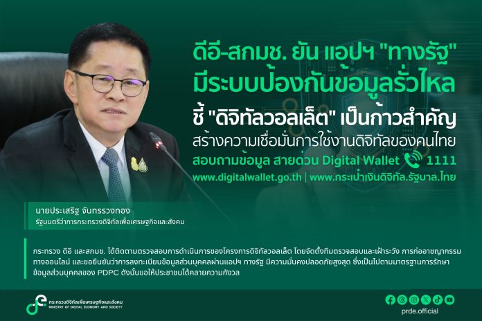 นายประเสริฐ จันทรรวงทอง รัฐมนตรีว่าการกระทรวงดิจิทัลเพื่อเศรษฐกิจและสังคม (ดีอี) ในฐานะประธานกรรมการกำกับดูแลด้านความมั่นคงปลอดภัยไซเบอร์ เปิดเผยว่า กรณีที่มีการเผยแพร่ข้อความบิดเบือนเกี่ยวกับโครงการเติมเงิน 10,000 บาท ผ่าน Digital Wallet หรือ “ดิจิทัลวอลเล็ต” ว่า ประชาชนที่ลงทะเบียนเข้าใช้งาน แอปพลิเคชัน “ทางรัฐ” ไร้การรักษาความมั่นคงปลอดภัยของข้อมูลส่วนบุคคล และเสี่ยงข้อมูลรั่วไหล นั้น ขอยืนยันว่าไม่เป็นความจริง ซึ่งข้อความดังกล่าว หากมีการเผยแพร่ออกไปสู่วงกว้างจะเป็นผลกระทบต่อความเชื่อมั่นด้านการใช้งานดิจิทัลของประชาชน โดยเฉพาะความเชื่อมั่นเกี่ยวกับโครงการสำคัญของรัฐบาล
