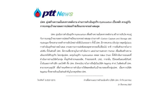 ฝ่ายสื่อสารและภาพลักษณ์องค์กร บริษัท ปตท. จำกัด (มหาชน) ออกมาชี้แจงว่า ปตท. มุ่งเน้นการดำเนินธุรกิจ Hydrocarbon เพื่อสร้างความมั่นคงทางพลังงาน สร้างการเติบโต ควบคู่กับการบรรลุเป้าหมายลดการปล่อยก๊าซเรือนกระจกอย่างสมดล ผ่านการทํา Carbon Capture and Storage และHydrogen ซึ่งจะสามารถสร้างการเติบโตอย่างยั่งยืนในระยะยาว