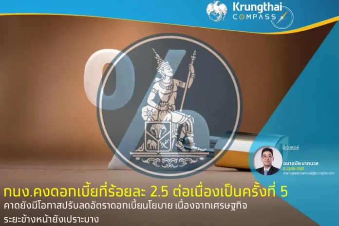 กรณี กนง. มีมติ 6 ต่อ 1 เสียง ให้คงอัตราดอกเบี้ยนโยบายไว้ที่ 2.50% ต่อปี ซึ่งอยู่ในระดับเดิมต่อเนื่องเป็นครั้งที่ 5 เนื่องจากประเมินว่าเศรษฐกิจไทยมีแนวโน้มขยายตัวด้วยแรงขับเคลื่อนจากภาคการท่องเที่ยวและอุปสงค์ในประเทศเป็นสำคัญ ขณะที่อัตราเงินเฟ้อทั่วไปมีแนวโน้มปรับลงได้มากกว่าที่มองไว้ โดยอัตราเงินเฟ้อคาดการณ์ระยะปานกลางยังคงสอดคล้องกับกรอบเป้าหมาย