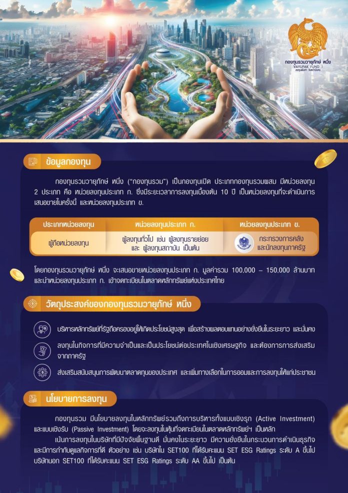 “กองทุนรวมวายุภักษ์ หนึ่ง” พร้อมเสนอขายหน่วยลงทุนประเภท ก. แก่ผู้ลงทุนทั่วไป มูลค่ารวม 1 แสน – 1.5 แสนล้านบาท ชูอัตราผลตอบแทนขั้นต่ำ 3.0% ต่อปี และขั้นสูงไม่เกิน 9.0% ต่อปี คงที่ตลอด 10 ปี พร้อมเปิดให้ผู้ลงทุนทั่วไปที่เป็นผู้ลงทุนรายย่อยในประเทศจองซื้อวันที่ 16 – 20ก.ย.นี้ ที่ราคาหน่วยละ 10 บาท เริ่มต้นที่ 1,000 หน่วย หรือเท่ากับ 10,000 บาท เสนอขายผ่านบริษัทจัดการ และธนาคาร 6 แห่ง ผู้ลงทุนรายย่อยได้รับการจัดสรรด้วยวิธีSmall Lot First เพื่อกระจายหน่วยลงทุนอย่างเท่าเทียมและคาดว่าจะนำหน่วยลงทุนประเภท ก. เข้าจดทะเบียนในตลาดหลักทรัพย์ฯ ภายในเดือนตุลาคมนี้