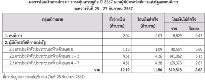 โฆษกกระทรวงการคลังกล่าวว่า การโอนเงินเมื่อวันที่ 27 กันยายน 2567 ให้ผู้มีบัตรสวัสดิการแห่งรัฐที่มีเลขประจำตัวประชาชนลงท้ายด้วยเลข 4 – 7 จำนวน 4.51 ล้านราย พบว่า มีการโอนเงินไม่สำเร็จจำนวน 129,373 ราย ทำให้มียอดสะสมของการโอนเงินให้แก่กลุ่มเป้าหมายสำเร็จแล้วรวมทั้งสิ้น 11.86 ล้านราย และการโอนเงินไม่สำเร็จจำนวน 319,8180 ราย