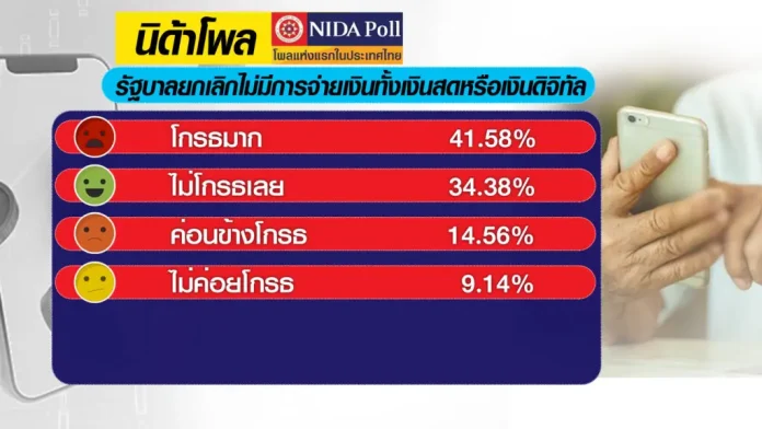 รัฐบาลตัดสินใจยกเลิกโครงการ ไม่มีการจ่ายเงินไม่ว่าจะเป็นเงินสดหรือเงินดิจิทัล พบว่า ตัวอย่าง ร้อยละ 41.58 ระบุว่า โกรธมาก รองลงมา ร้อยละ 34.38 ระบุว่า ไม่โกรธเลย ร้อยละ 14.56 ระบุว่า ค่อนข้างโกรธ ร้อยละ 9.14 ระบุว่า ไม่ค่อยโกรธ
