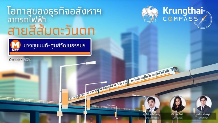 Business Highlight Online : 1 พฤศจิกายน 2567 ศูนย์วิจัย Krungthai COMPASS ประเมินโครงการรถไฟฟ้าสายสีส้มตะวันตก “บางขุนนนท์-ศูนย์วัฒนธรรมฯ” หนุนการขยายตัวของเมือง และช่วยกระตุ้นตลาดที่อยู่อาศัยโดยรอบรถไฟฟ้า คาดมีมูลค่าเพิ่มขึ้นจาก 39,000 ล้านบาทต่อปี เป็น 50,000 ล้านบาทต่อปีในอนาคต แนะผู้ประกอบการอสังหาฯ พัฒนาโครงการใน Segment ยอดนิยมแต่ละพื้นที่