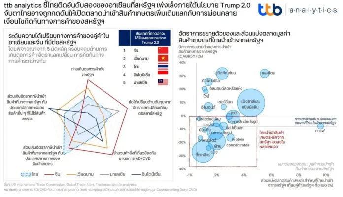 ศูนย์วิเคราะห์เศรษฐกิจ ทีทีบี หรือ ttb analytics ประเมินว่า ไทยมีความเสี่ยงจะถูกเพ่งเล็งจากมาตรการกีดกันทางการค้าของสหรัฐฯ ภายใต้นโยบาย Trump 2.0 สูงเป็นอันดับที่ 2 ของอาเซียน จากการที่สหรัฐฯ เสียเปรียบทางการค้ากับไทยในหลายมิติ ไม่ว่าจะเป็นการเกินดุลการค้าของไทยสูง ข้อได้เปรียบด้านต้นทุนจากการอ่อนค่าของค่าเงินบาท จำนวนคำสั่งมาตรการ AD และ CVD ในหลายประเภทสินค้าสูงกว่าคู่เทียบ โดยเฉพาะการจัดเก็บภาษีนำเข้าสินค้าเกษตรของไทยในอัตราที่ค่อนข้างสูงเมื่อเทียบกับคู่ค้ารายอื่น ซึ่งอาจทำให้สหรัฐฯ นำมาเป็นข้อต่อรองในการพิจารณาขึ้นกำแพงภาษีนำเข้าระลอกใหม่ ส่งผลให้ไทยมีความเสี่ยงที่จะถูกกดดันให้เปิดตลาดนำเข้าสินค้าเกษตรที่สำคัญเพิ่มเติม อาทิ เนื้อสัตว์และเครื่องในสัตว์ ถั่วเหลือง และข้าวโพดเลี้ยงสัตว์