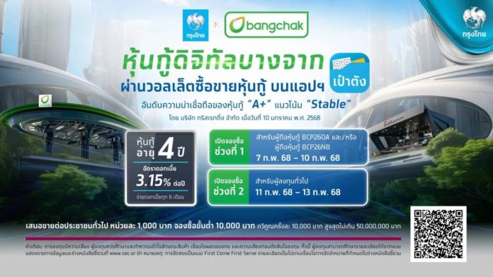 เตรียมตัว! จองซื้อ “หุ้นกู้ดิจิทัลบางจาก” บนแอปฯ “เป๋าตัง” อายุ 4 ปี ดอก 3.15% ต่อปี จองซื้อ 7-13 ก.พ.
