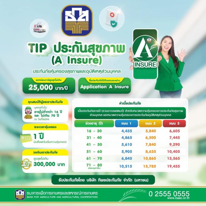 ธนาคารเพื่อการเกษตรและสหกรณ์การเกษตร (ธ.ก.ส.) ร่วมกับ บริษัท ทิพยประกันภัย จำกัด (มหาชน) เพิ่มช่องทางให้ลูกค้าสามารถเลือกซื้อประกันด้วยตนเองได้สะดวกและรวดเร็วตลอด 24 ชั่วโมง ผ่านแอปพลิเคชัน “A Insure” กับประกันภัยสุขภาพและอุบัติเหตุส่วนบุคคลทิพยพรีเมี่ยม “TIP ประกันภัยสุขภาพ” ค่าเบี้ยประกันเริ่มต้นที่ 4,435 บาทต่อปี คุ้มครองสูงสุด 300,000 บาทต่อรอบปีกรมธรรม์ หมดกังวลกับทุกค่าใช้จ่าย ทั้งกรณี เจ็บป่วยและอุบัติเหตุด้วยวงเงินค่ารักษาพยาบาล และยังให้ความคุ้มครองกรณีเสียชีวิต ทุพพลภาพถาวรสิ้นเชิง เหมาะกับผู้ที่ต้องการความคุ้มครองยามเจ็บป่วย ผู้สมัครต้องมีอายุไม่ต่ำกว่า 16 ปี และไม่เกิน 70 ปี (ณ วันที่สมัคร) สัญชาติไทย มีสุขภาพร่างกายแข็งแรงสมบูรณ์ สมัครง่ายๆ ได้ด้วยตนเองทางแอปพลิเคชัน “A Insure” เลือกเมนูซื้อประกันภัยกรอกข้อมูล ตรวจสอบค่าเบี้ย รายละเอียดกรมธรรม์ และชำระเงินค่าประกันเสร็จแล้ว บริษัทผู้รับประกันจะส่งกรมธรรม์ฯ ให้ผ่านทาง E-mail หรือที่อยู่ที่แจ้งไว้ นอกจากนี้ ธ.ก.ส. ยังมีผลิตภัณฑ์ประกันภัยอื่นๆ ที่น่าสนใจให้ลูกค้าเลือกซื้อผ่านแอปพลิเคชัน “A Insure” ได้แก่ ประกันภัยรถยนต์ทั้งภาคบังคับและภาคสมัครใจ ประกันภัยเดินทางทั้งในและต่างประเทศ ประกันภัยอุบัติเหตุ PA Super Plus , PA MINI , PA ปลอดภัยวัยเกษียณ และประกันภัยไซเบอร์ ติดต่อสอบถามรายละเอียดเพิ่มเติม ได้ที่ ธ.ก.ส. ทุกสาขาทั่วประเทศ หรือ Call Center 02 555 0555