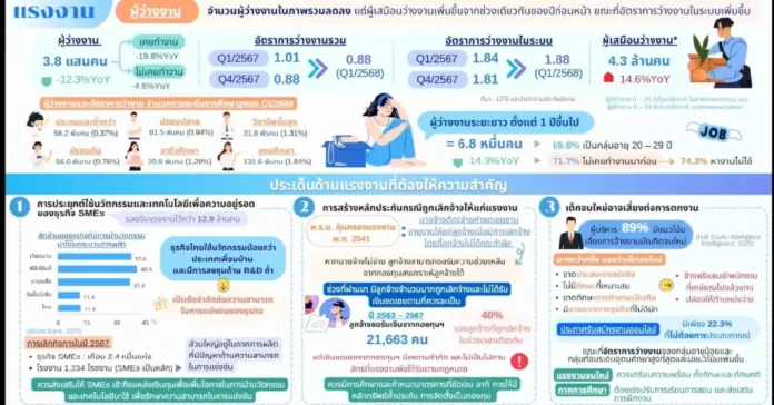สำหรับตัวเลขผู้มีงานทำอยู่ที่ 39.4 ล้านน โดยเฉพาะภาคเกษตรกรรมมีการจ้างงานลดลงต่อเนื่อง ส่วนนอกภาคเกษตรขยายตัวได้เล็กน้อย โดยเฉพาะสาขาโรงแรมและภัตตาคารยังคงขยายตัวได้ที่ 3.5% แม้จำนวนนักท่องเที่ยวต่างชาติจะเริ่มลดลง เช่นเดียวกับสาขาการขนส่งและเก็บสินค้าที่ขยายตัวต่อเนื่อง 4.5% ขณะที่การจ้างงานในสาขาการผลิตเริ่มหดตัวลงเล็กน้อยที่ 0.4% ส่วนเด็กจบใหม่อาจเสี่ยงตกงาน โดยพบว่ามีสัดส่วนผู้ว่างงานในกลุ่มที่อุดมศึกษาสูงถึง 131,600 คน หรือ 1.84% ซึ่งถือว่าสูงที่สุดในทุกระดับการศึกษา ขณะเดียวกันจำนวนแรงงานที่อยู่ในภาวะการทำงานต่ำกว่าศักยภาพ (Underemployment) มีแนวโน้มเพิ่มขึ้น โดยเฉพาะในภาคการค้าและบริการ สะท้อนถึงผลกระทบจากภาวะเศรษฐกิจที่ยังคงชะลอตัว ผู้ประกอบการไทยเกิดปัญหาด้านการแข่งขันและมีผลต่อกลุ่มธุรกิจขนาดกลางและขนาดย่อม (SMEs) อย่างชัดเจน โดยในช่วงที่ผ่านมา มี SMEs ปิดกิจการกว่า 24,000 แห่ง และโรงงานอีก 1,234 แห่ง
