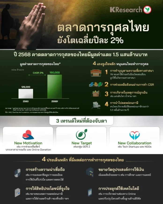 ศูนย์วิจัยกสิกรไทยประเมินตลาดการกุศลไทยยังเติบโตเฉลี่ยปีละ 2% (CAGR 2560-2568) คาดมีมูลค่าแตะ 1.5 แสนล้านบาท ในปี 2568