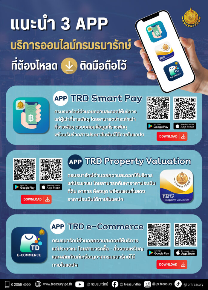 1.TRD Smart Pay “ชำระค่าเช่าที่ราชพัสดุ ได้ทุกที่ ทุกเวลา” เป็นแอปพลิเคชันที่จะอำนวยความสะดวกแก่ผู้เช่าที่ราชพัสดุ โดยครอบคลุมบริการต่างๆ ได้แก่ ชำระค่าเช่าที่ราชพัสดุ ตรวจสอบข้อมูลที่ราชพัสดุ การตรวจสอบข้อมูล การเช่าที่ราชพัสดุ อัตราค่าเช่า สัญญาเช่า แปลงที่ราชพัสดุที่เช่า การตรวจสอบรายการที่ต้องชำระเงิน ค่าเช่า ค่าธรรมเนียม หลักประกันการเช่า และเงินอื่นๆ การชำระเงินออนไลน์ผ่านบัตรเครดิต/เดบิต (Payment Gateway) และผ่านสถาบันการเงินชั้นนำ (Page to Page) รวม 7 แห่ง ประกอบด้วย บมจ. ธนาคารกรุงไทย ธนาคารออมสิน บมจ. ธนาคารกรุงศรีอยุธยา บมจ. ธนาคารไทยพาณิชย์ บมจ.ธนาคารทหารไทย บมจ. ธนาคารกสิกรไทย และ บมจ. ธนาคารกรุงเทพ โดยไม่มีค่าใช้จ่ายในการใช้บริการแต่อย่างใด และสามารถยื่นคำร้องขอดำเนินการต่างๆ เช่น ขอโอนสิทธิ สืบสิทธิ รังวัดแนวเขตการเช่า เป็นต้น รวมถึงการติดตามสถานะ และผลการดำเนินงานของเจ้าหน้าที่ พร้อมระบบการแจ้งเตือนอัตโนมัติเพื่อให้ผู้เช่าที่ราชพัสดุสามารถเข้าถึงข้อมูลข่าวสารประชาสัมพันธ์จากกรมธนารักษ์ได้ตลอดเวลา