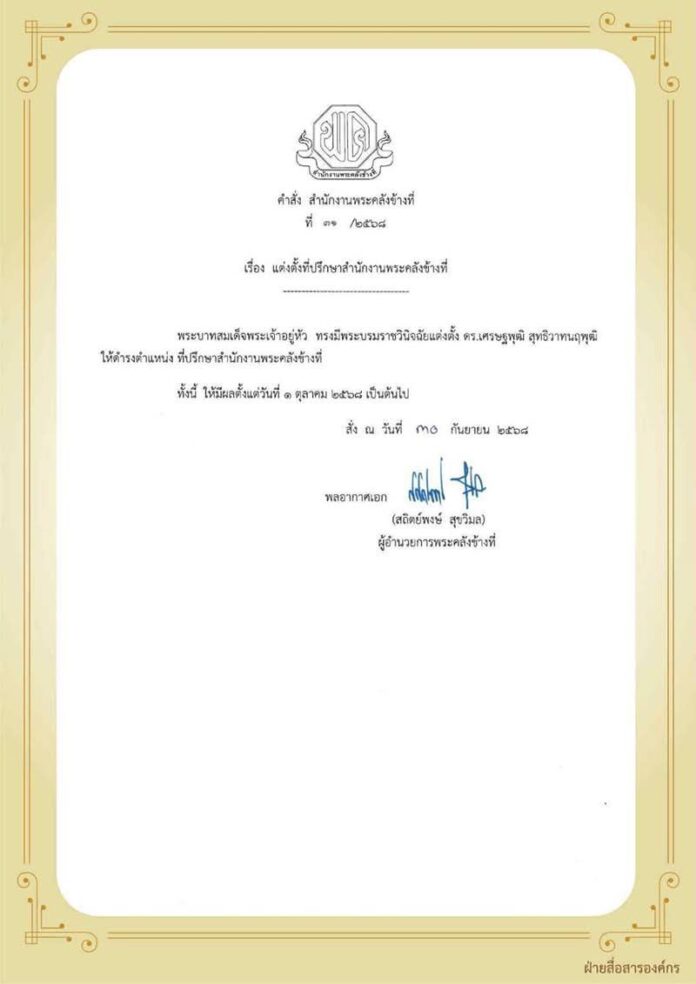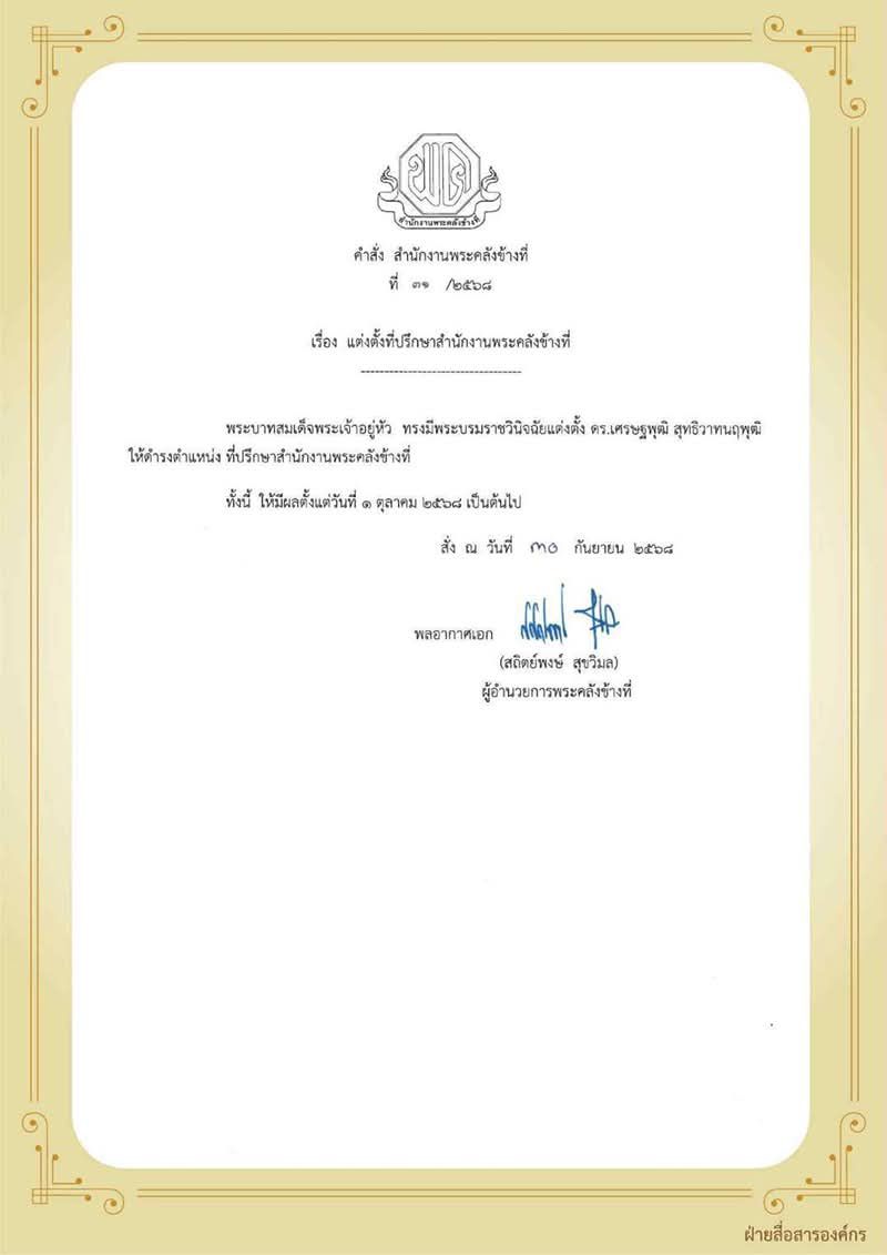 วันที่ 30 กันยายน 2568 พล.อ.อ.สถิตย์พงษ์ สุขวิมล ผู้อำนวยการพระคลังข้างที่ ลงนามในคำสั่ง สำนักงานพระคลังข้างที่ ที่ 31/2568 เรื่อง แต่งตั้งที่ปรึกษาสำนักงานพระคลังข้างที่ พระบาทสมเด็จพระเจ้าอยู่หัว ทรงมีพระบรมราชวินิจฉัยแต่งตั้ง นายเศรษฐพุฒิ สุทธิวาทนฤพุฒิ อดีตผู้ว่าการธนาคารแห่งประเทศไทย (ธปท.) ให้ดำรงตำแหน่ง ที่ปรึกษาสำนักงานพระคลังข้างที่