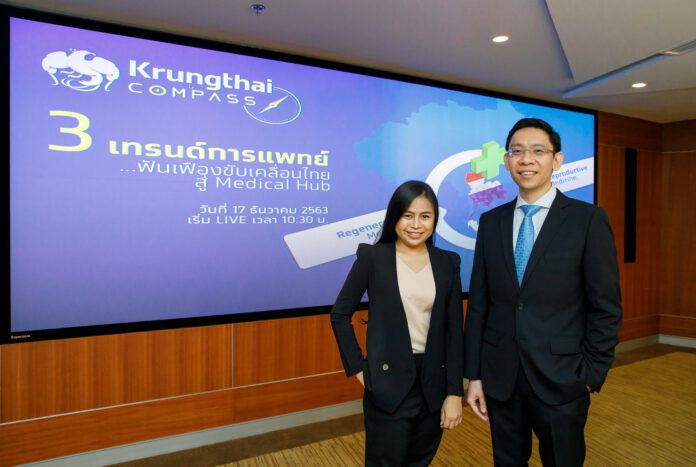 น.ส.สุจิตรา อันโน นักวิเคราะห์ ศูนย์วิจัย Krungthai COMPASS กล่าวว่า เทรนด์การแพทย์สมัยใหม่ที่จะส่งเสริมให้ไทยเข้าใกล้ความฝันการเป็น Medical Hub ประกอบด้วย 1. การแพทย์แม่นยำ (Precision Medicine) หรือการแพทย์เฉพาะเจาะจง เป็นนวัตกรรมทางการแพทย์ที่สามารถนำข้อมูลทางพันธุกรรมมาใช้ในการตรวจวินิจฉัย การรักษา การเลือกใช้ยา การทำนายผลการรักษา เพื่อให้ได้ผลการรักษาที่มีประสิทธิภาพมากที่สุด โดยคาดว่าจะมีมูลค่าในตลาดโลกสูงถึง 4.77 หมื่นล้านเหรียญสหรัฐ ในปี 2568 หรือเติบโตเฉลี่ยปีละ 9.7% 2. เวชศาสตร์ฟื้นฟูสภาวะเสื่อม (Regenerative Medicine) หรือการแพทย์เชิงฟื้นฟู เป็นการแพทย์สมัยใหม่ที่มุ่งเน้นการทดแทน การซ่อมเสริม การฟื้นฟูเซลล์และเนื้อเยื่อ รวมถึงอวัยวะที่ได้รับบาดเจ็บหรือเสื่อมถอยจากอายุที่มากขึ้น คาดว่าภายในปี 2564 จะมีมูลค่าในตลาดโลกเพิ่มขึ้น 2.5 เท่าจากปี 2562 แตะระดับ 7.68 หมื่นล้านเหรียญฯ เติบโตเฉลี่ยถึง 19.8% ต่อปี และ 3. เวชศาสตร์การเจริญพันธุ์ (Reproductive Medicine) เป็นการรักษาภาวะมีบุตรยาก โดยการใช้เทคโนโลยีช่วยการเจริญพันธุ์ อาทิ IVF, ICSI, IUI ซึ่งคาดว่าในปี 2568 จะมีมูลค่าตลาดโลกกว่า 2.29 หมื่นล้านเหรียญฯ คิดเป็นอัตราเติบโตเฉลี่ย 9% ต่อปี ซึ่งวิธีที่ได้รับความนิยมอย่างแพร่หลาย คือ การทำเด็กหลอดแก้ว โดยไทยมีชื่อเสียงด้านนี้อยู่พอสมควร