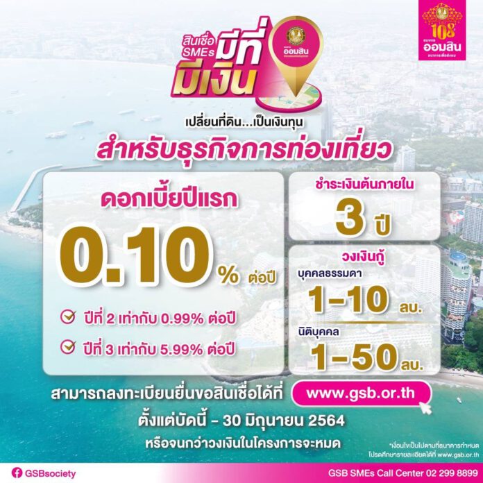 business highlight online : เปิดกู้สินเชื่อ “SMEs มีที่ มีเงิน” รอบใหม่ ช่วยธุรกิจท่องเที่ยวที่ได้รับผลกระทบ COVID-19 ลงทะเบียนยื่นกู้ทาง www.gsb.or.th ตั้งแต่บัดนี้ ถึง 30 มิถุนายน 2564