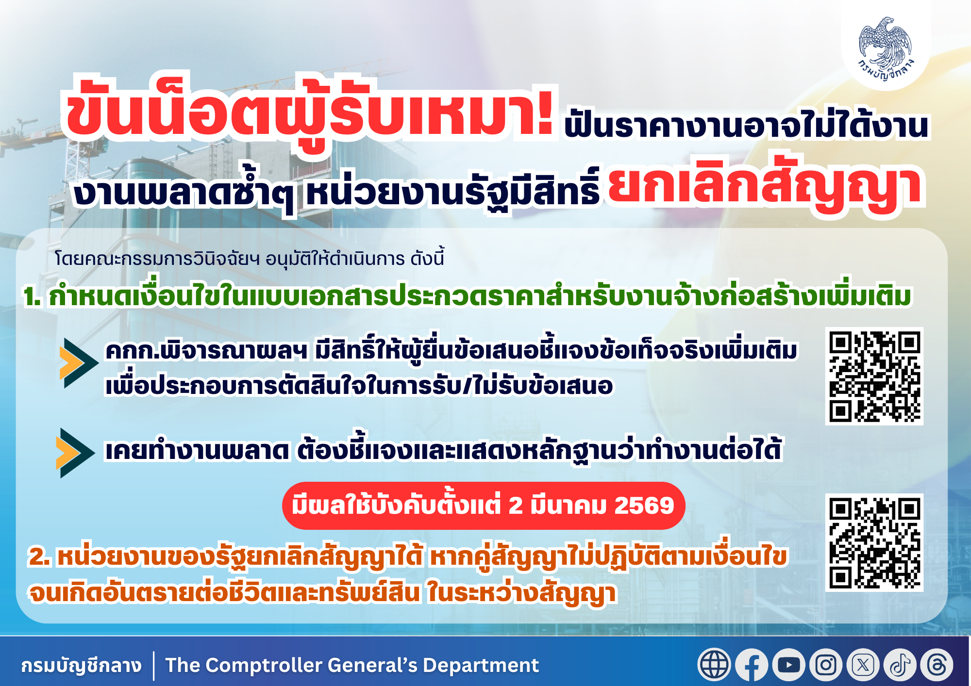 “การกำหนดเงื่อนไขเพิ่มเติมในเอกสารประกวดราคาสำหรับงานจ้างก่อสร้าง และการกำหนดเงื่อนไขในการพิจารณายกเลิกสัญญาของหน่วยงานของรัฐนั้น จะช่วยเพิ่มความเข้มข้นในการคัดเลือกผู้ประกอบการงานก่อสร้างของภาครัฐโดยให้โอกาสหน่วยงานของรัฐพิจารณาถึงความพร้อมของผู้ประกอบการที่เสนอราคาต่ำสุดแต่ไม่มีมาตรฐานในการปฏิบัติงาน อีกทั้งหากผู้รับจ้างไม่รักษามาตรฐานระหว่างดำเนินการตามสัญญาอาจถูกยกเลิกสัญญาได้” อธิบดีกรมบัญชีกลางกล่าว