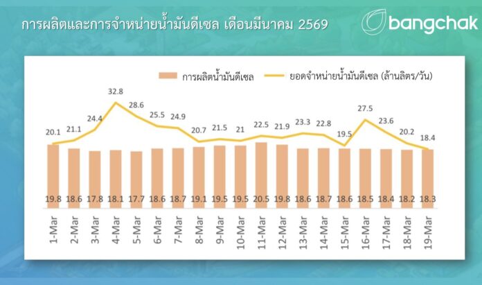จากข้อมูลในเดือนมีนาคม 2569 พบว่า ยอดจำหน่ายมีความผันผวนและเพิ่มสูงกว่าระดับการผลิตในหลายช่วง โดยเริ่มเห็นสัญญาณตั้งแต่ช่วงต้นเดือน และเพิ่มสูงขึ้นอีกครั้งในช่วงกลางเดือน สะท้อนว่าความต้องการใช้น้ำมันเพิ่มขึ้นอย่างรวดเร็วในระยะสั้น โดยมีสถานีบริการบางส่วนต้องปิดให้บริการชั่วคราวในบางช่วงเวลา คิดเป็นประมาณร้อยละ 10-20 ของสถานีบริการทั้งหมด ส่งผลให้การรับและหมุนเวียนน้ำมันในบางพื้นที่ไม่ทันต่อความต้องการ อนึ่ง หลังจากการกระจายน้ำมันสามารถดำเนินการได้ดีขึ้น สถานการณ์ได้เริ่มคลี่คลายตามลำดับ โดยจำนวนสถานีบริการที่ได้รับผลกระทบมีแนวโน้มลดลงต่อเนื่อง สถานีบริการส่วนใหญ่สามารถกลับมาให้บริการได้ภายใน 24-48 ชั่วโมง